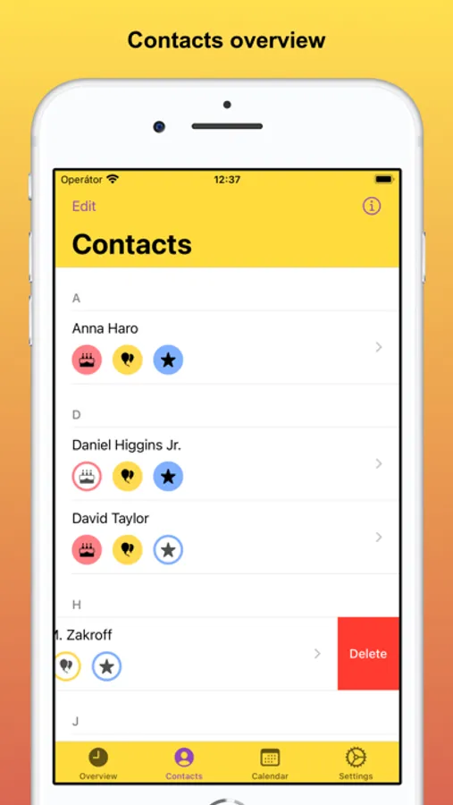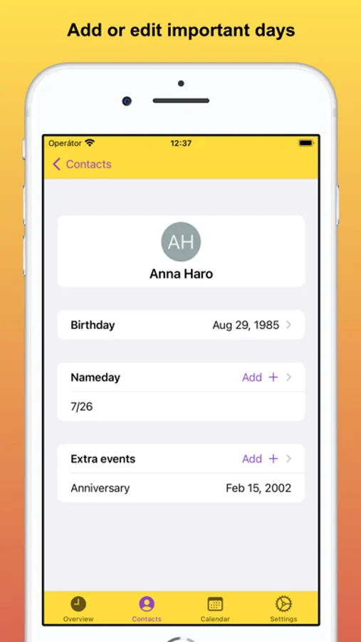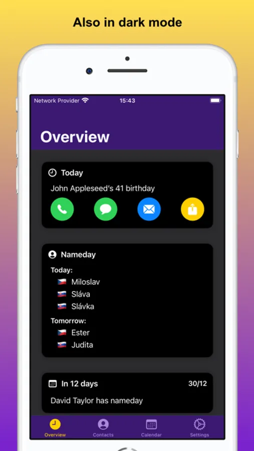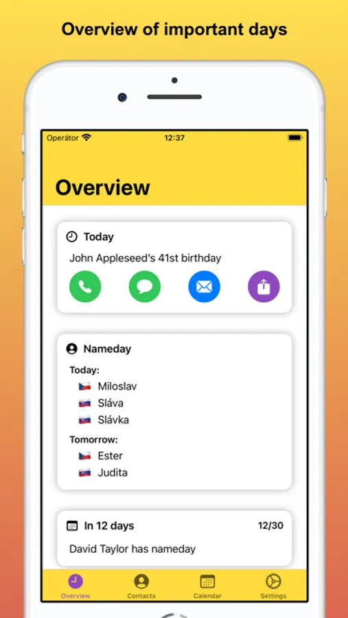 iDays will notify you, which of your contacts is celebrating birthday, nameday or other important day. Time of the notification can be set. You may then call or write message to the celebrating contacts.
