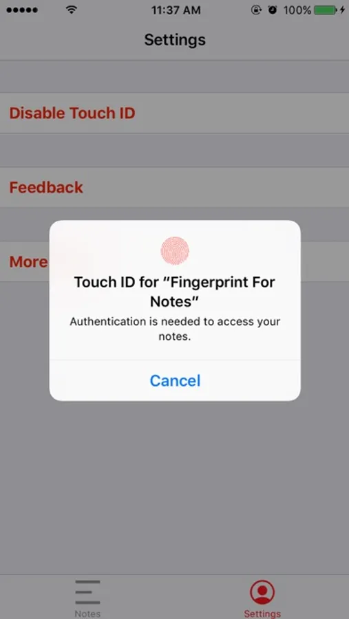 After launching the App for the first time. You are now in the setting page. Enable Touch ID - Face ID in the app. If your device is Touch ID - Face ID compatible then you can access the app with your touch ID. If not then the Touch ID button will be disabled. Press the home button, then enter the app and your notes are all secured.