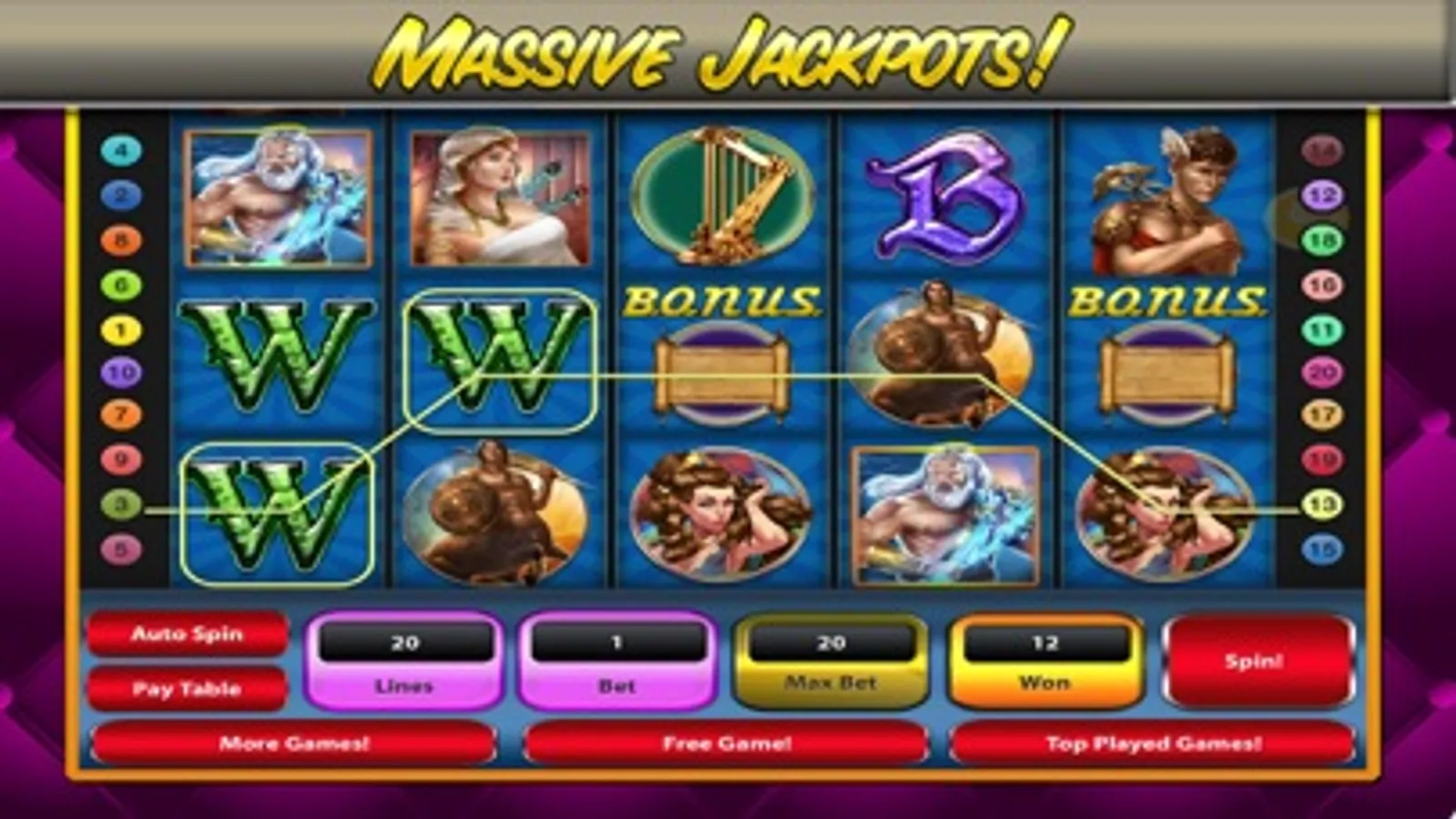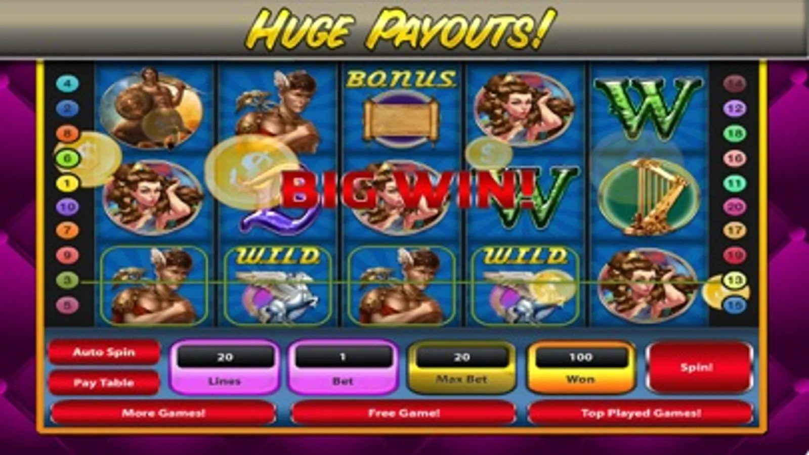 Battle with your favorite Greek Gods in Olympus! This 5 Reel Slot Machine has tons of bonus features and Huge Payouts for continued free play .