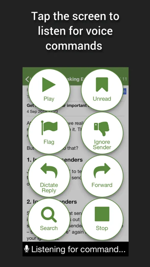 Voice recognition needs a trigger. You choose when to pause for a command - on full screen tap, every 30 seconds, at the start/end of emails.