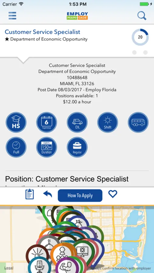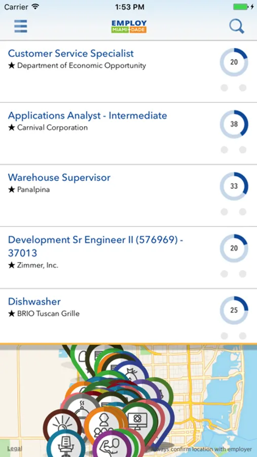 With Employ Miami Dade Mobile’s unique “Jobs Nearby” function you can easily map all the latest jobs near your current location. Search for jobs around your neighborhood or a different location. Simply tap color-coordinated pins to see more information or to apply for a job.