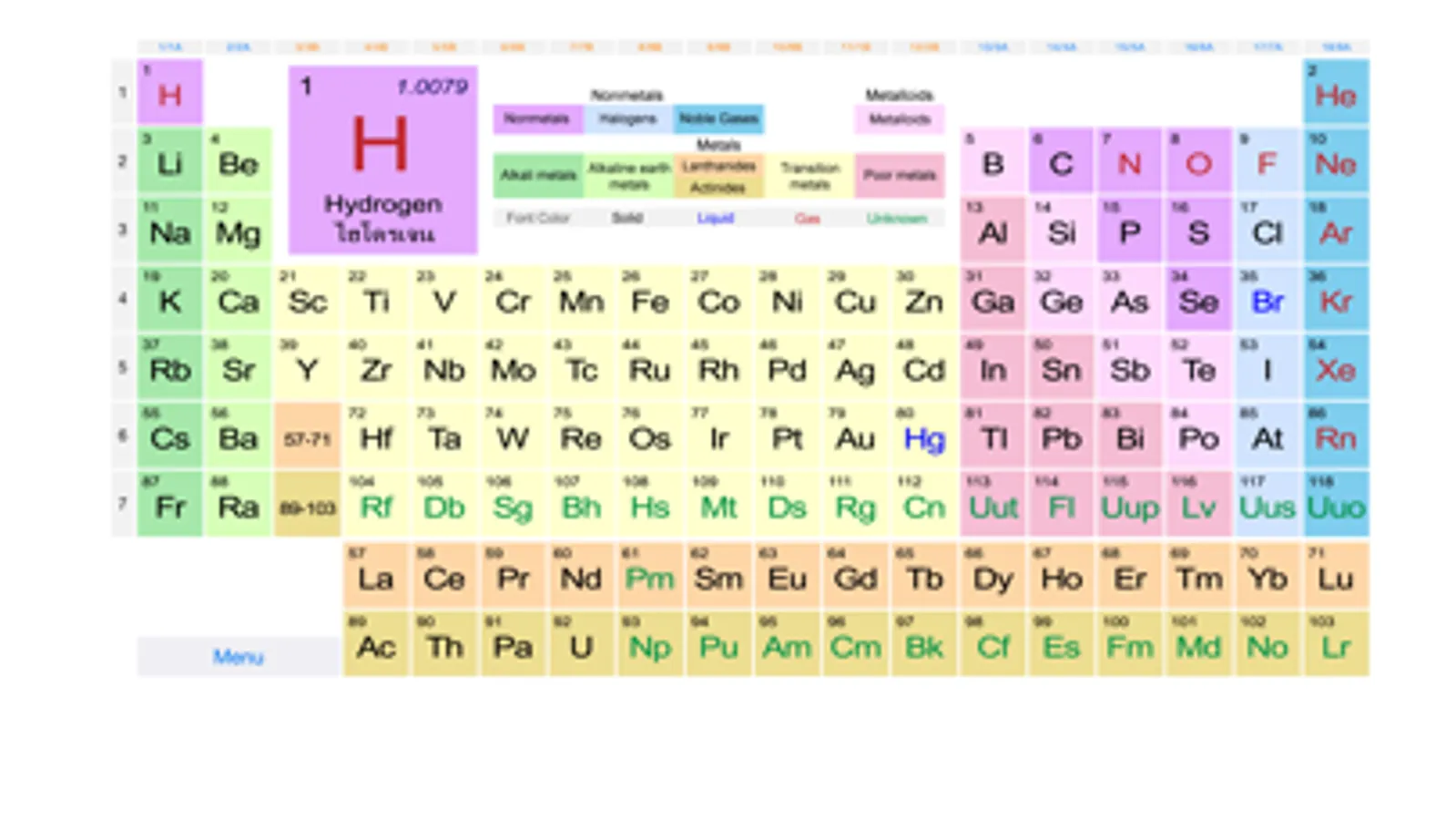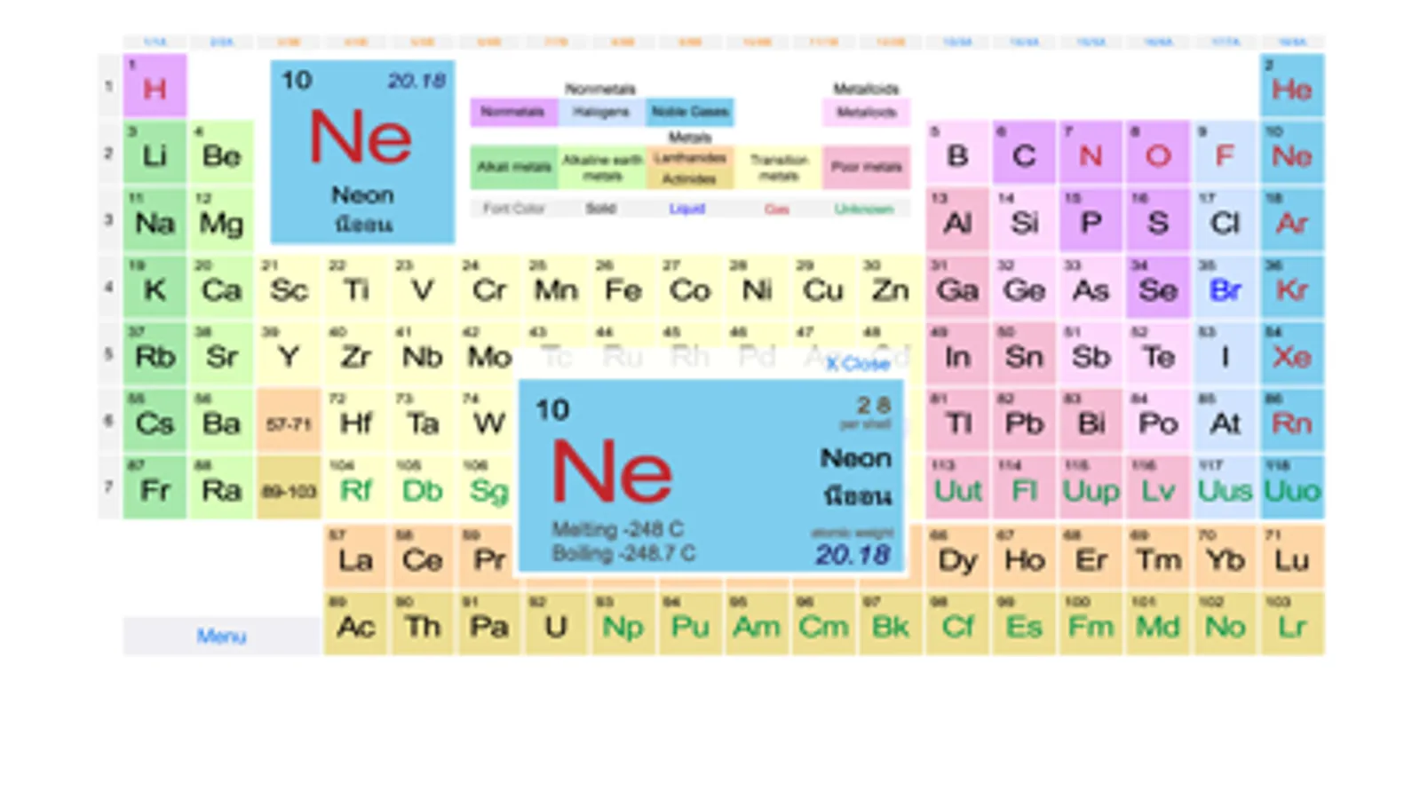 Informations: chemical symbol, name, atomic number, atomic weight, group, period, melting point, boiling point, phase and per shell.