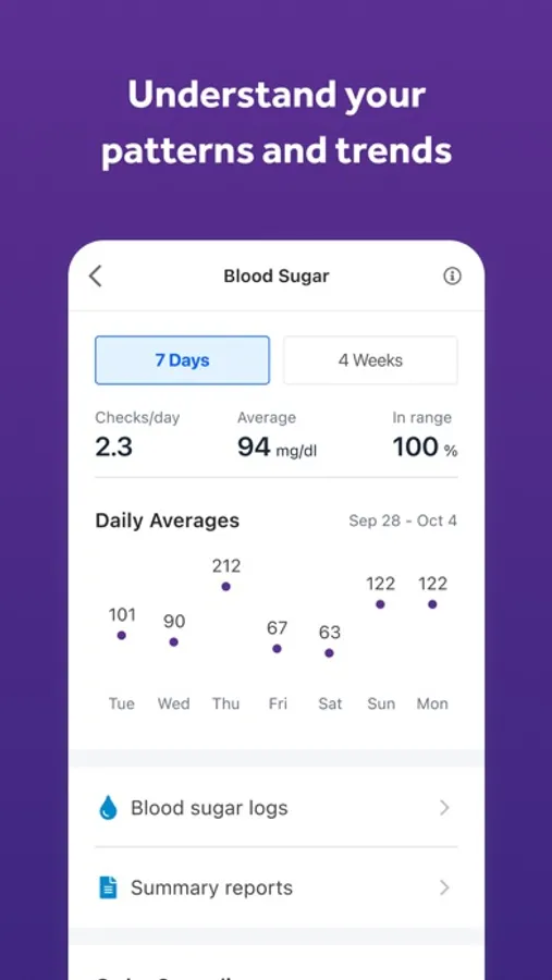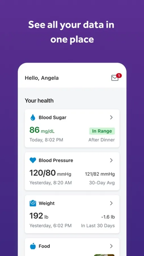 Record every blood sugar, blood pressure, and weight reading, as well as daily steps counts, and view them all from one place in the app. You can gather insights, learn, and adapt your routine.