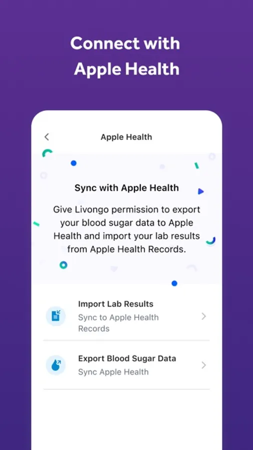 Sync with Apple Health to further customize your Livongo experience. You’ll be able to import your Apple Health lab results and export your Livongo blood sugar data to Apple Health.