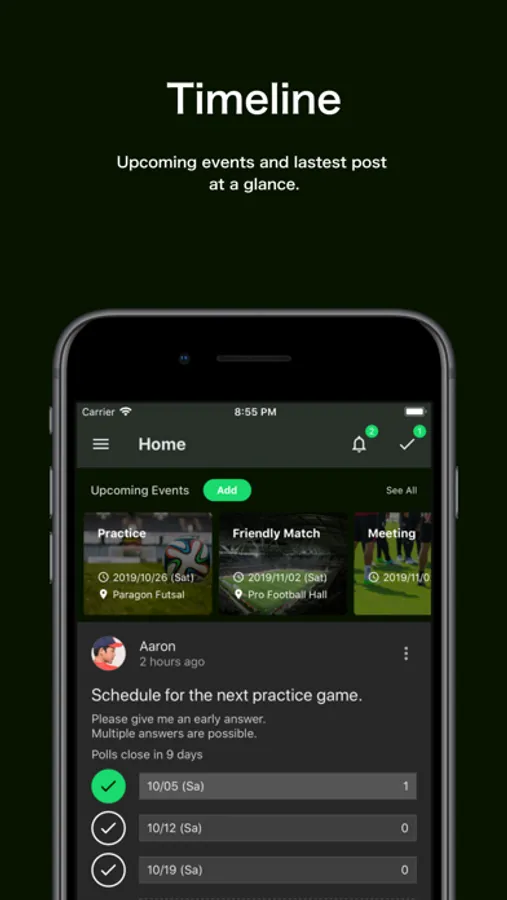 * FEED - Feed is the hub for all team communication. Quickly view upcoming events and latest posts to keep yourself updated with what's going on with your team. Create surveys and questionnaires to collect members opinions and event availabilities.