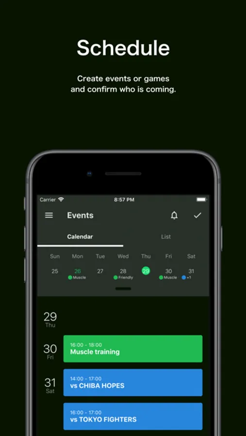 * PRACTICE AND GAME SCHEDULING - Calendar view makes it easy to access up-to-date practice and game schedules. List view is a little more detailed and lets you see the number of comments and attendees for each event.