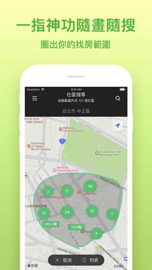 2.地圖模式:用手指即可圈出找房範圍,自動定位精準找房