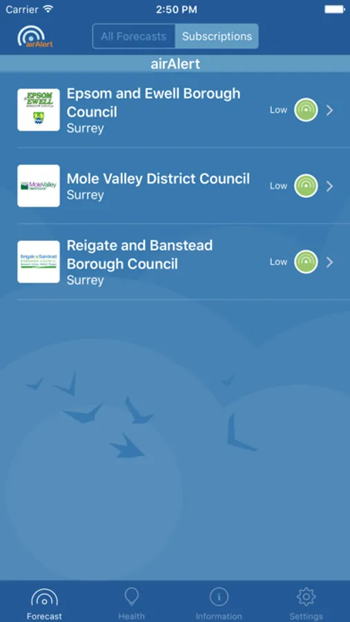 The airAlert app allows users to see forecast air pollution and cold levels in chosen areas on the south of England.