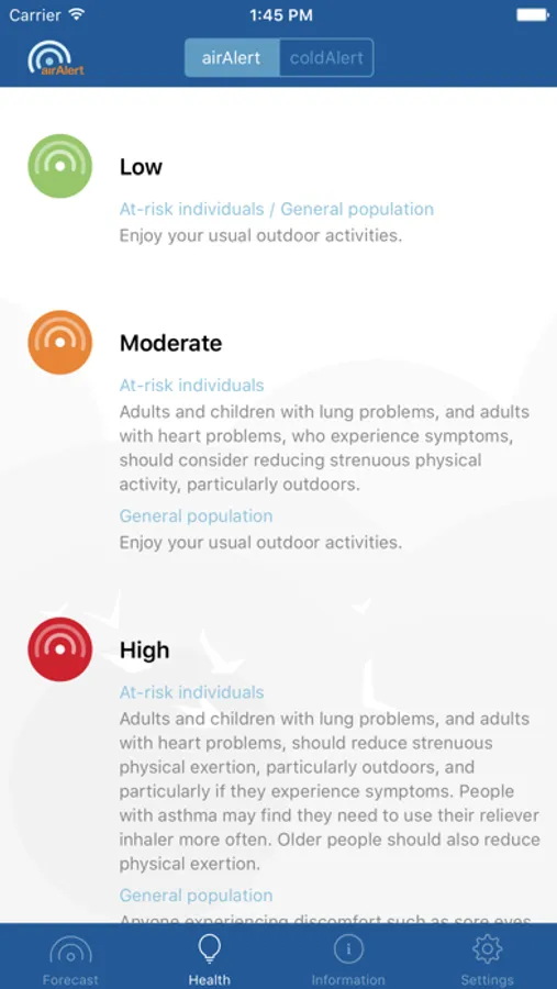 airAlert is targeted at people with respiratory health problems who may be affected by air pollution or cold.