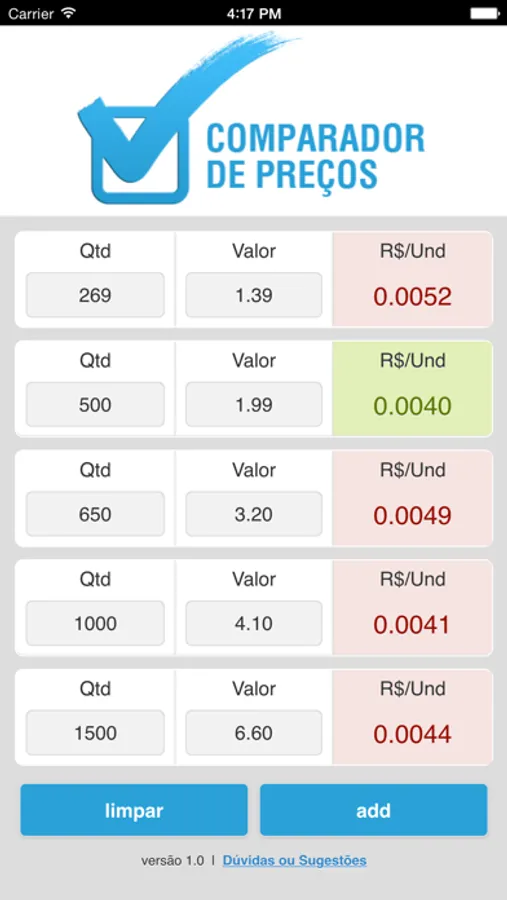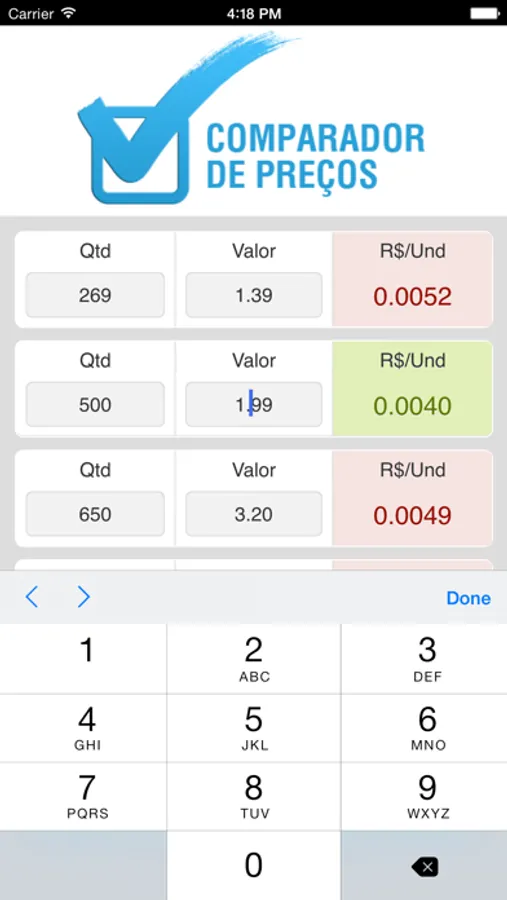 Basta digitar a quantidade e o valor dos produtos que o Comparador de