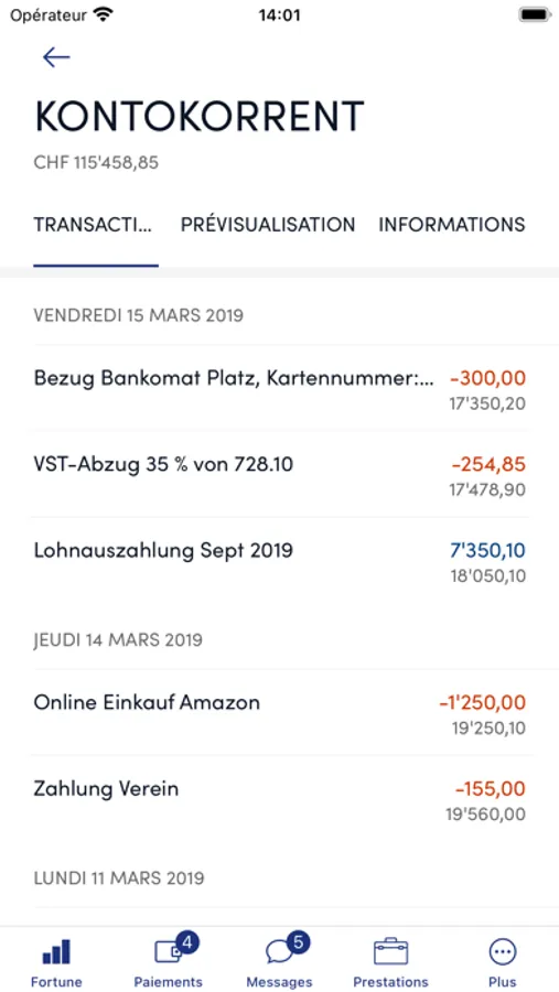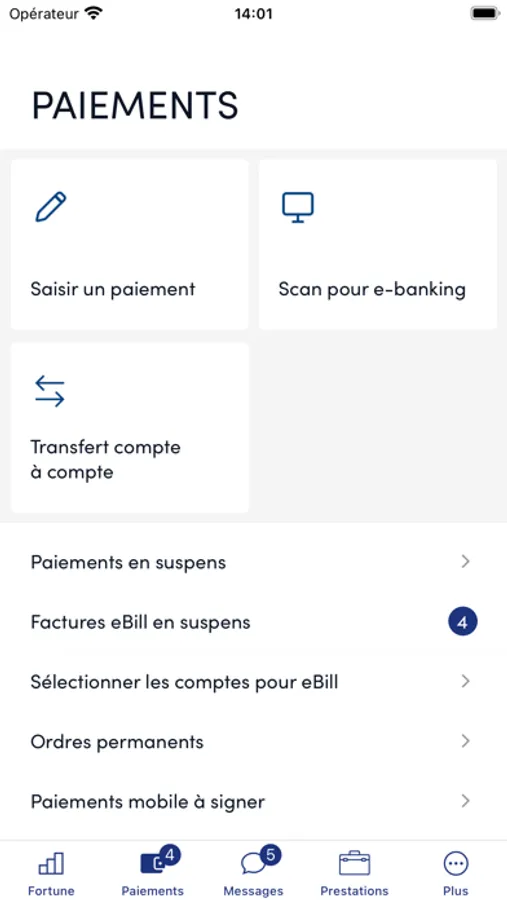 - Saisir vos paiements (paiement en Suisse uniquement, transfert de compte à compte, gérer les e-factures)