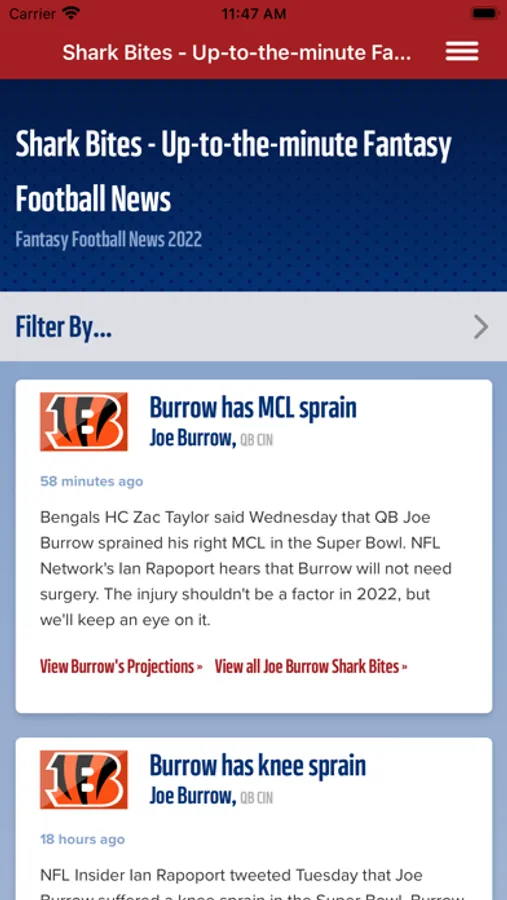 --Sharkbites: Up to the minute, year-round NFL news -- plus our take on what it means for your fantasy team. If selected, you’ll also receive a push notification for breaking news on your favorited players.
