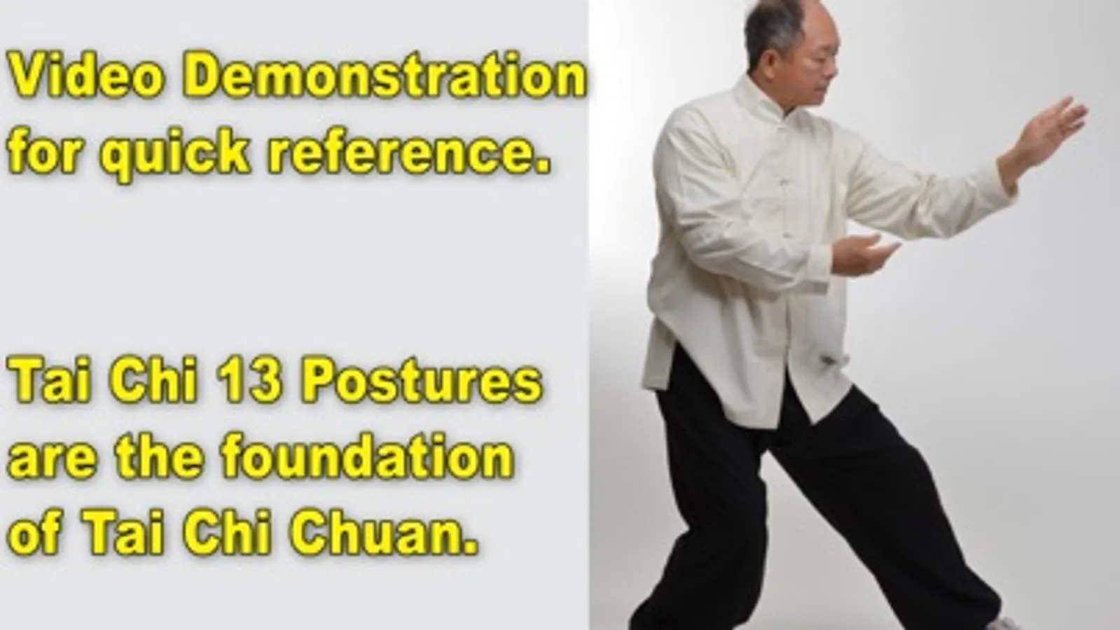 Streaming videos about the Thirteen Postures of Tai Chi Chuan. First you will learn the Eight Moving Patterns, or Postures, known as Peng, Lu, Ji, An, Cai, Lie, Zhou, and Kao. Then, the Five Steps: forward, backward, left, right, and center.