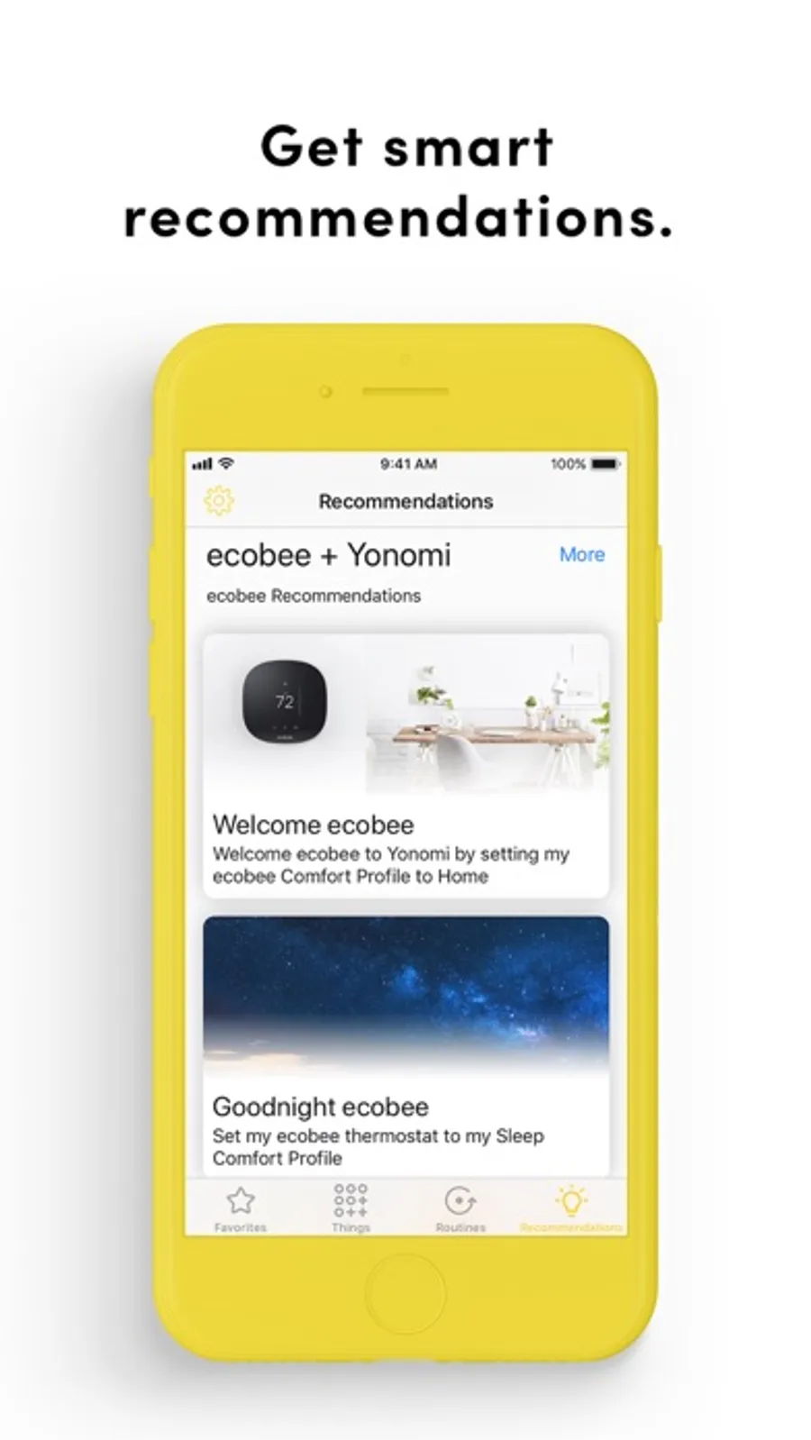 Yonomi provides intelligent in-app recommendations for smart home Routines based on the devices you already own.