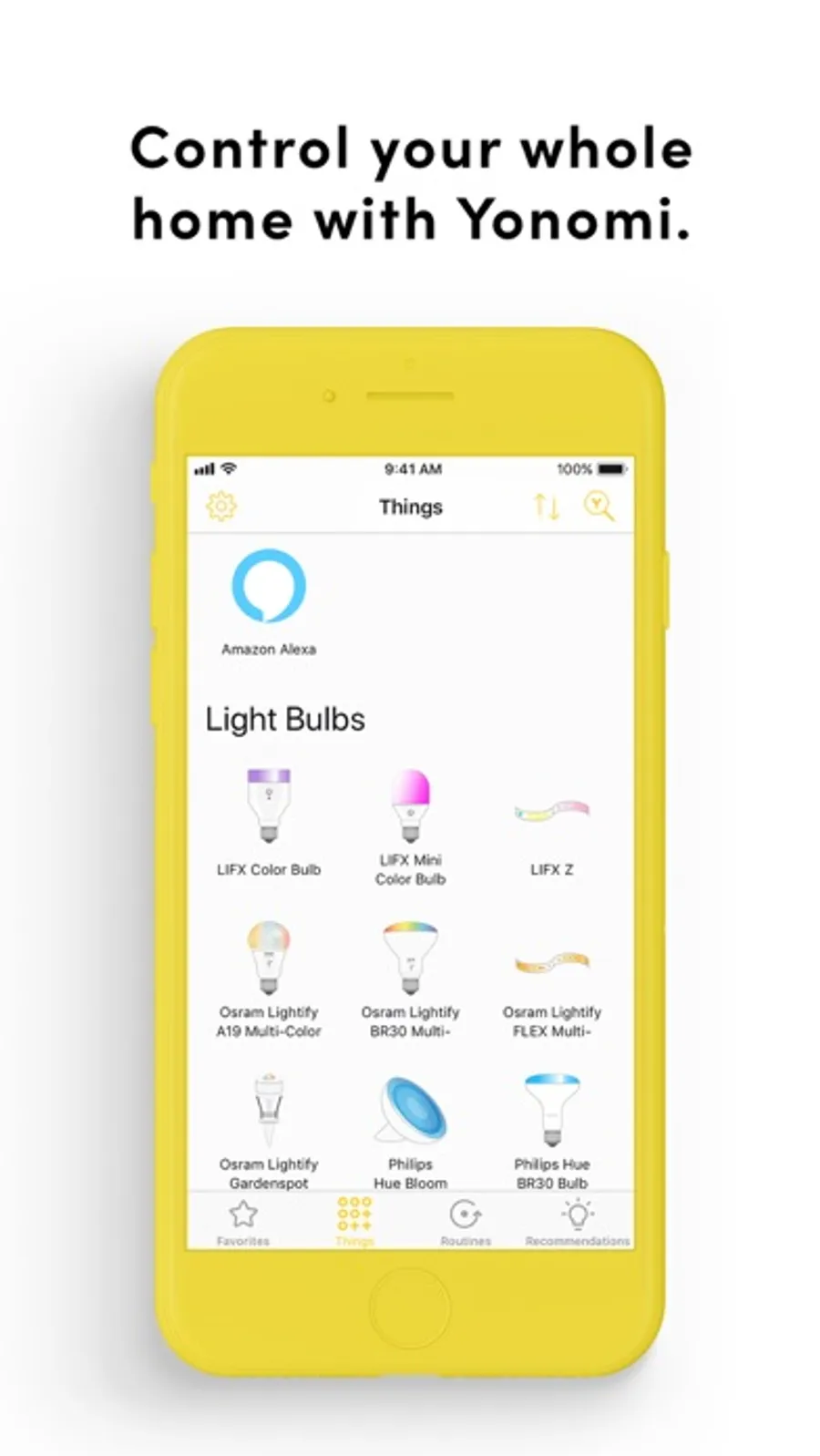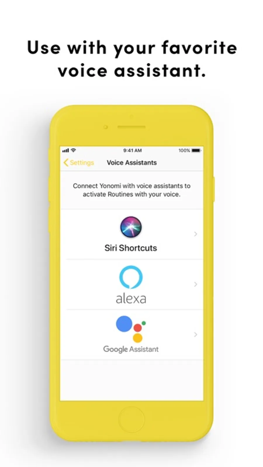 Yonomi makes it simple for anyone to turn their home into a smart home. Just download the app, connect your existing devices, and set up automated Routines for every room and every time of day.