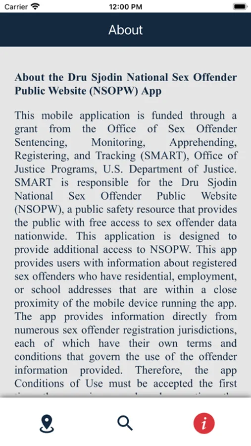 This is the official U.S. Department of Justice national sex offender search app. This app is funded through a grant from the Office of Sex Offender Sentencing, Monitoring, Apprehending, Registering and Tracking (“SMART”), Office of Justice Programs, U.S. Department of Justice. SMART is responsible for The Dru Sjodin National Sex Offender Public Website (NSOPW), a public safety resource that provides the public with free access to sex offender data nationwide. This application is designed to provide additional access to NSOPW.