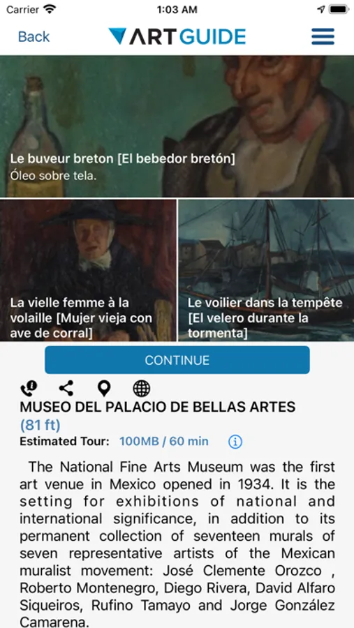 It can also show additional information about the museum or gallery: schedule, location and services such as bathrooms, atm, wardrobe, among others.