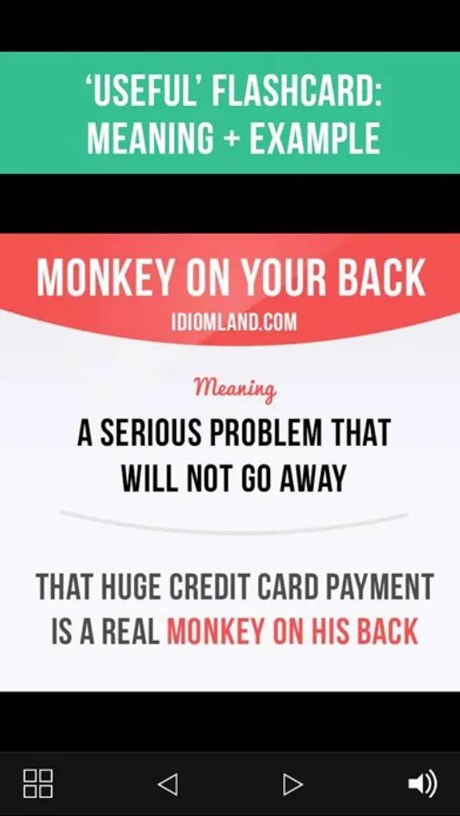 1. 'Useful' flashcard shows you an idiom, its meaning and an example.