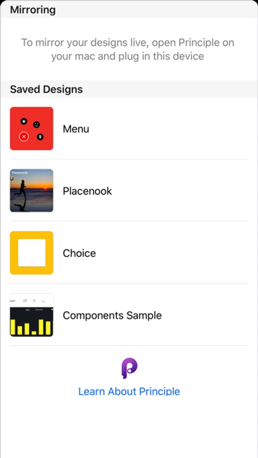 Principle Mirror is the companion app to Principle for Mac, a tool for designing interactive interfaces. Principle Mirror can open Principle files from other apps or mirror Principle for Mac when plugged in.