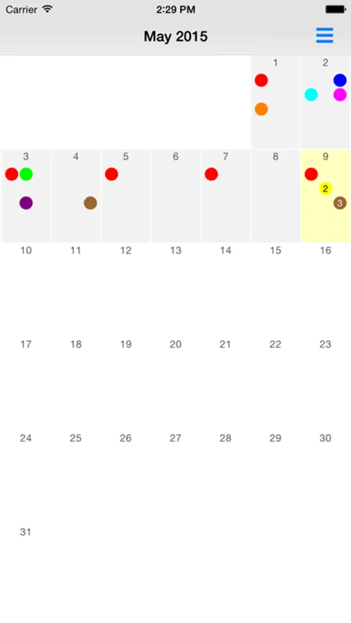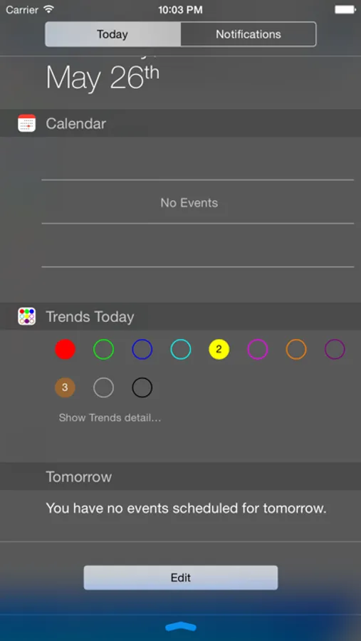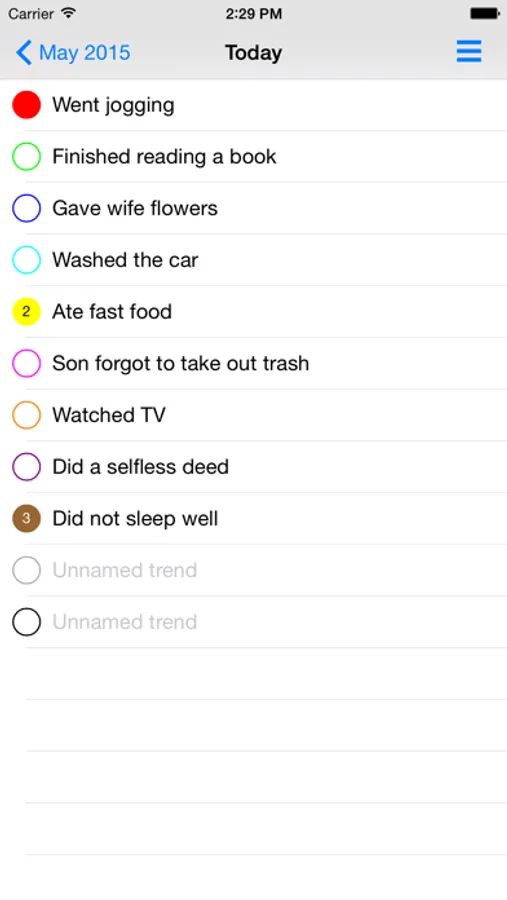 Simply choose a color and name for each type of event you want to track, collectively called a "trend". Then on a daily basis, if the event happens, tap the colored circle to mark it for that day. Additionally, each daily marking of a trend can have an associated number, which can be used to rate the event or count the number of times the event happened that day. Tap the marker equal to the number you want, up to nine.