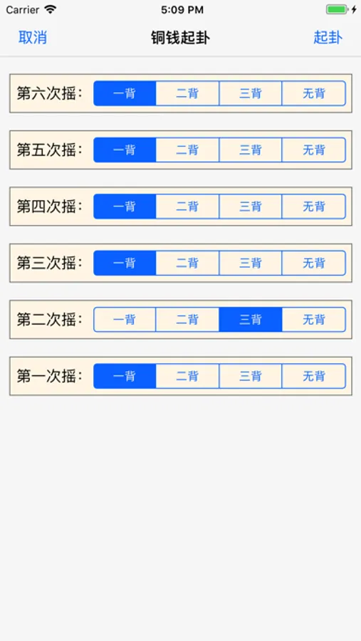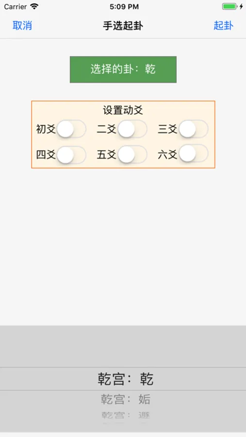 本程序有八种起卦方法,分别是“数字起卦”、“时间起卦”、“手选起卦”、“铜钱起卦”、“分秒起卦”、“模拟起卦”、“随机起卦”、“起终身卦”。