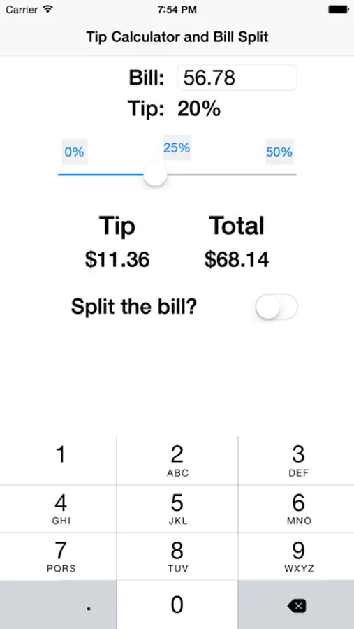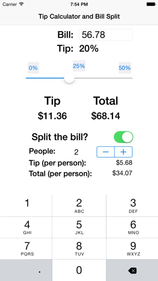 Calculate tip and split the bill among people. Simple one page design without unnecessary options.