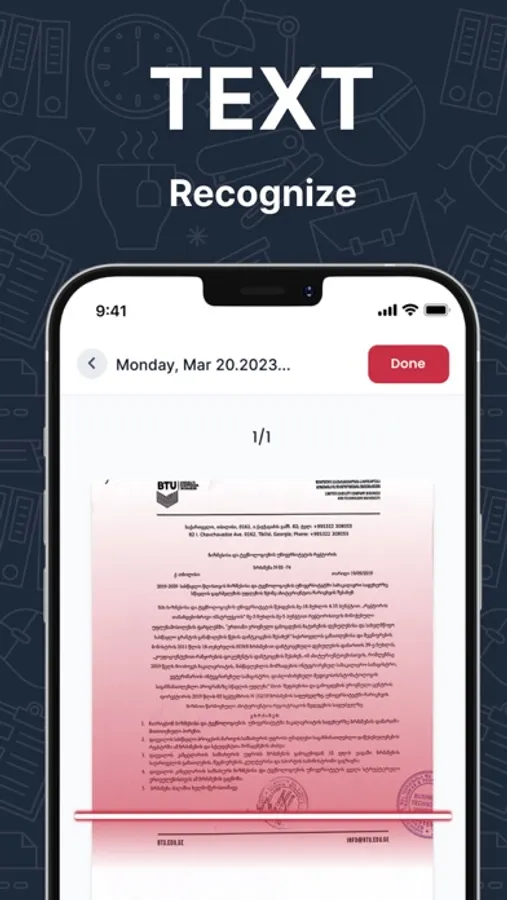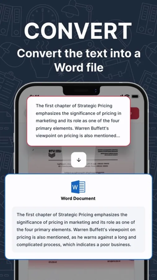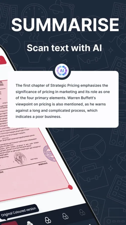 InstaScan's built in AI engine extracts text from scanned pages for you to copy. Moreover, it will suggest smart titles and generate summarised content from the whole scanned page.