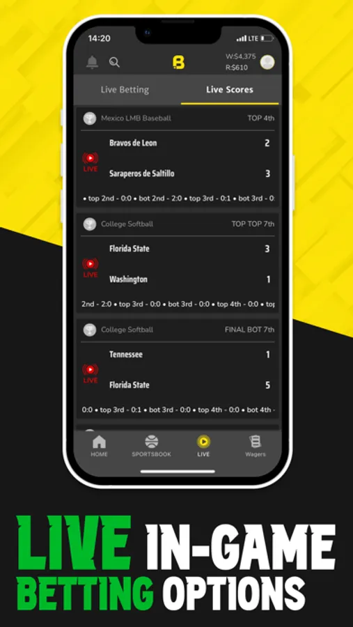 • Place bets with our LIVE In-Game feature to place wagers throughout the game!