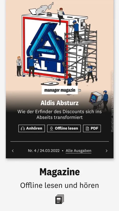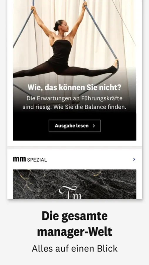 • Eine kompakte Übersicht: Entdecken Sie Wirtschaftsjournalismus in seiner ganzen Vielfalt, übersichtlich und hochwertig präsentiert. Steigen Sie ein, und erhalten Sie über die Navigationsleiste direkten Zugriff – in die tagesaktuellen Inhalte von manager magazin und Harvard Business manager sowie unsere digitalen Magazine. Die einzelnen Ausgaben können Sie herunterladen und bequem offline lesen.