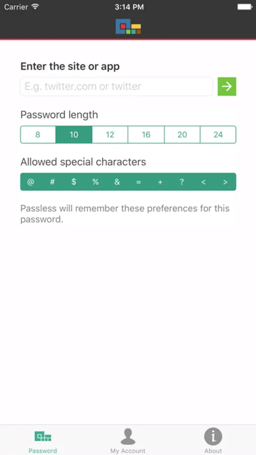Passless solves the problem of generating and remembering strong passwords for you. Just enter the name or address of a website. Passless' smart algorithm makes sure that it doesn't matter whether you, for instance, enter Twitter or http://login.twitter.com. For your convenience you can just copy/paste the web address into Passless.