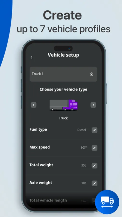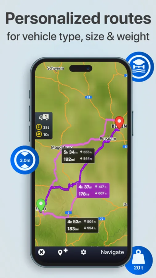 Enter your vehicle type, size, weight, number of trailers & other settings. The app calculates the route according to set parameters and prevents run-ins with hazards like low bridges or narrow streets.