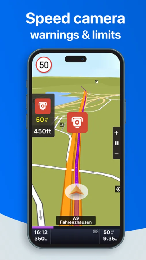 The sat nav app shows the current speed, the maximum allowed speed, and upcoming speed limit changes. You will get clear visual and sound alerts when you exceed the speed limit.