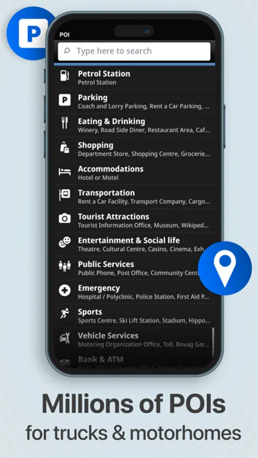 The app offers navigation specially tailored to specifications of: truck / HGV / RV / caravan / motorhome / camper / van / bus / car/ or car with trailer.