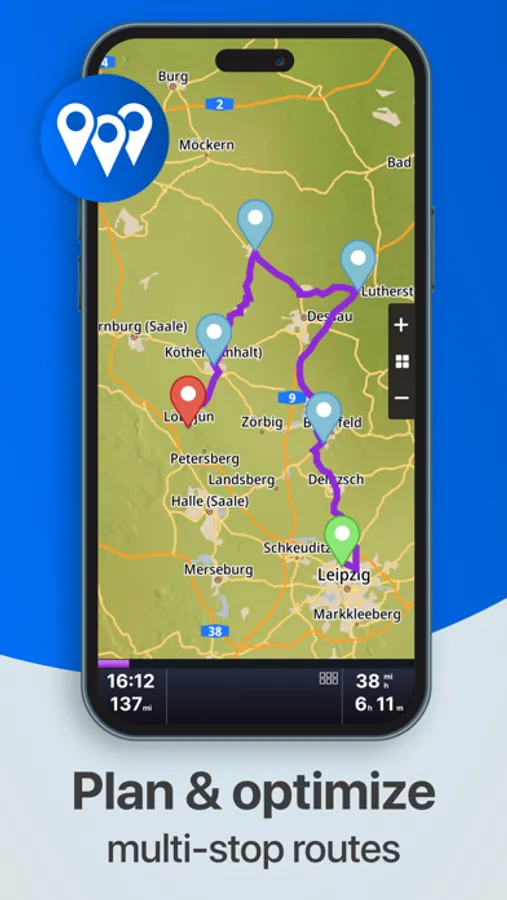 Plan your trip and set up routes with up to 150 waypoints. Easily customize the waypoint order or choose the option "Optimize." The app will rearrange the waypoints to achieve the best efficiency.