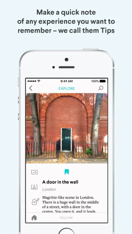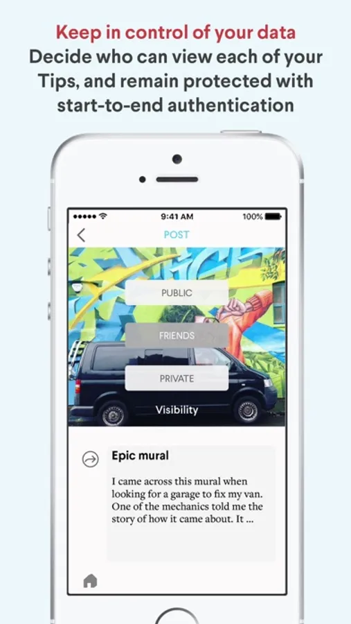 This app is an easy way to note those things and keep them accessible. You make a "tip" – a note with pictures, and maps as optional. And then for each tip you choose whether to keep the tip private, share it with friends, or make it public (and you can change your mind at any time).