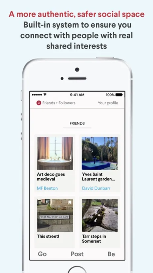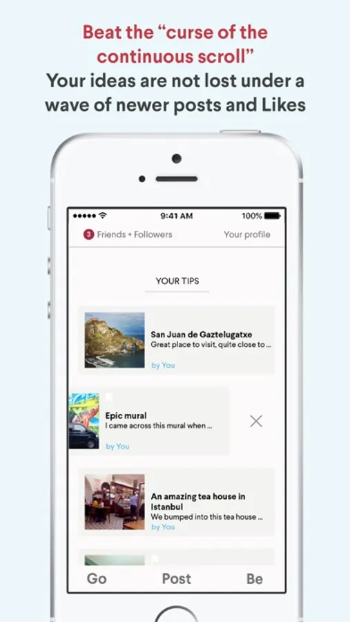 GoBe! has got rid of the addictive component of many apps, where your latest post disappears downwards by the push of newer posts, creating a social anxiety that can never be fulfilled.
