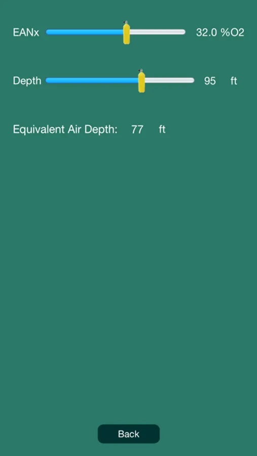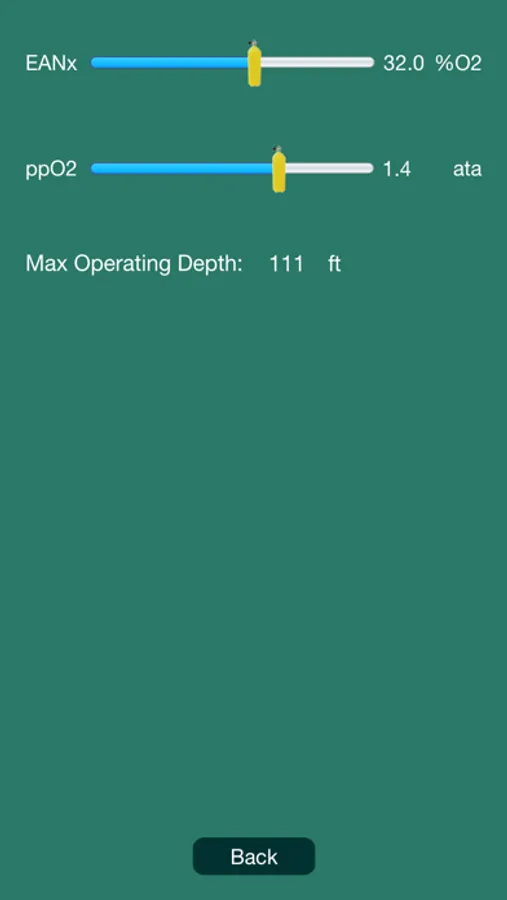 A calculator for determining the EAD, MOD, and Best Mix for a chosen SCUBA EANx, ppO2, and depth. The app uses simple sliders for changing the enriched air nitro mix, the partial pressure of oxygen, and the depth values. Optimized for the iPhone 5, 5s, & 6.