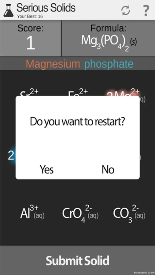 Good luck! We sincerely hope this game helps you learn how to predict the product of common precipitation reactions.