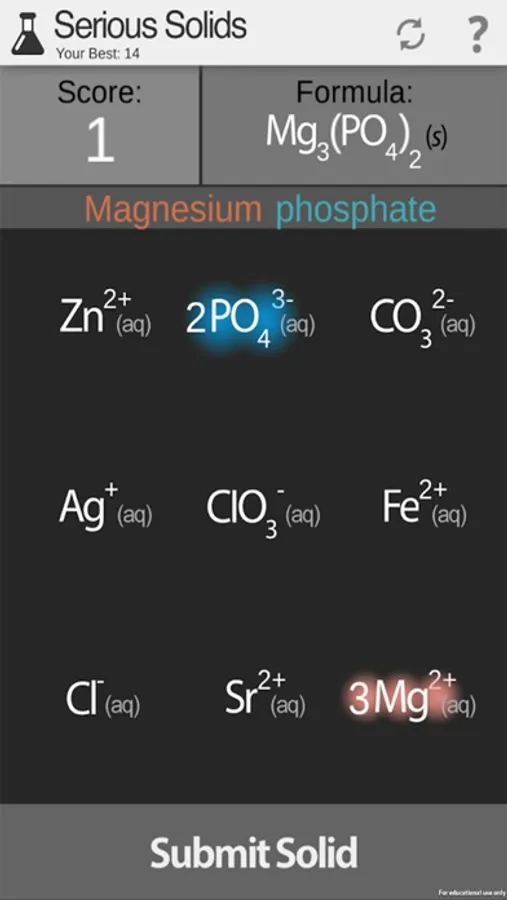 The goal of the game is to select the correct ratios of cations (+) and anions (-) that combine to form solid precipitates at 0.1M ion concentrations, neutral pH, and 25 degrees C. Experiment with the interface by clicking the ion symbols multiple times. When the name and formula looks good to you, submit your solid by clicking the button at the bottom of the screen. Swipe spectator ions away from the screen to remove them and to earn extra game points.