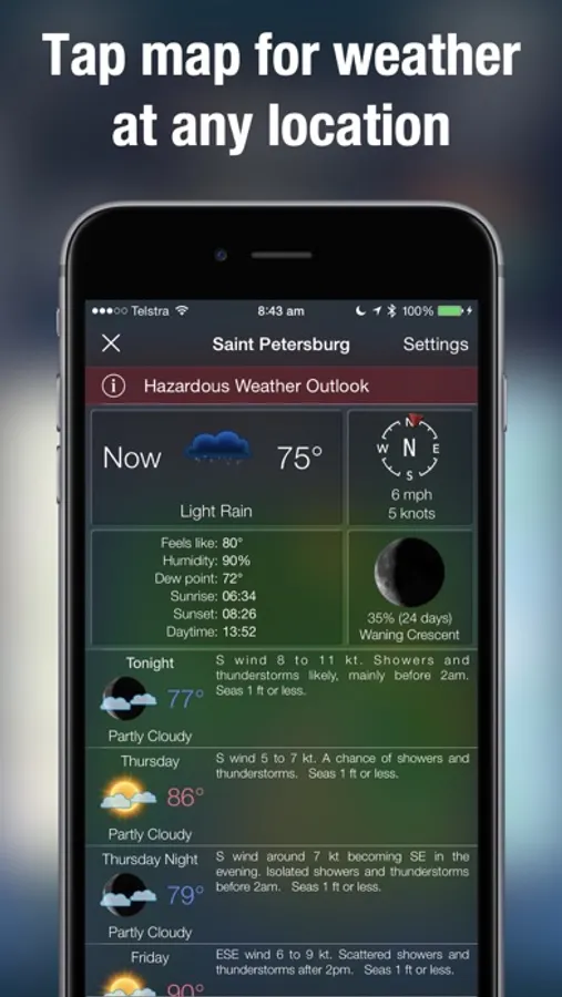 - Detailed 24 hour, 14 day weather forecast with current conditions - Land and marine weather warnings, alerts and advisories - affected areas displayed on map