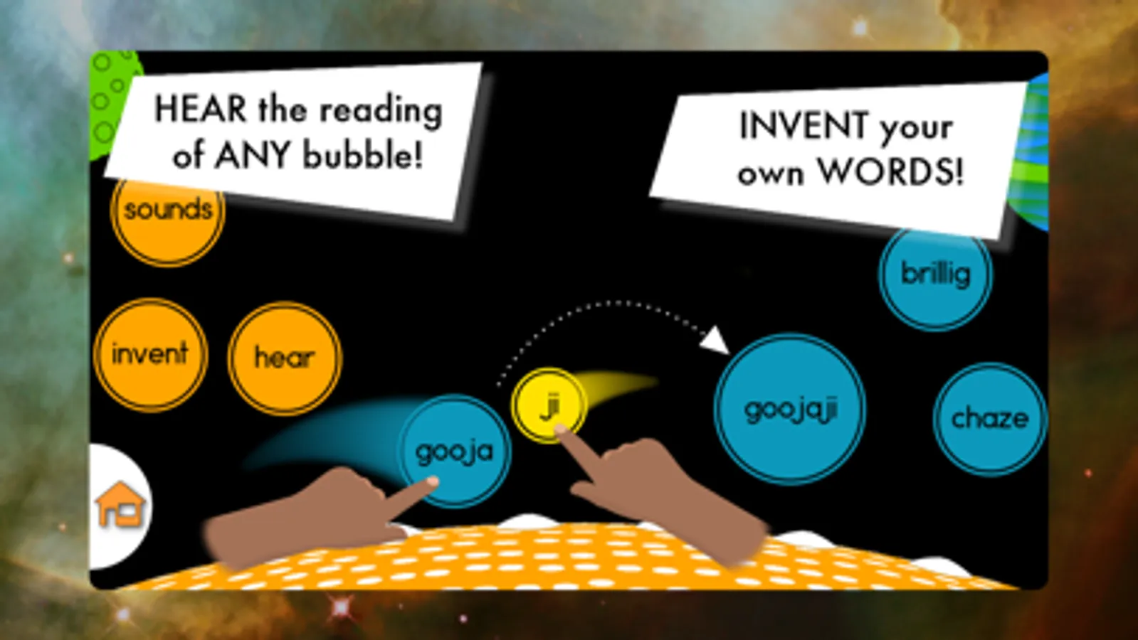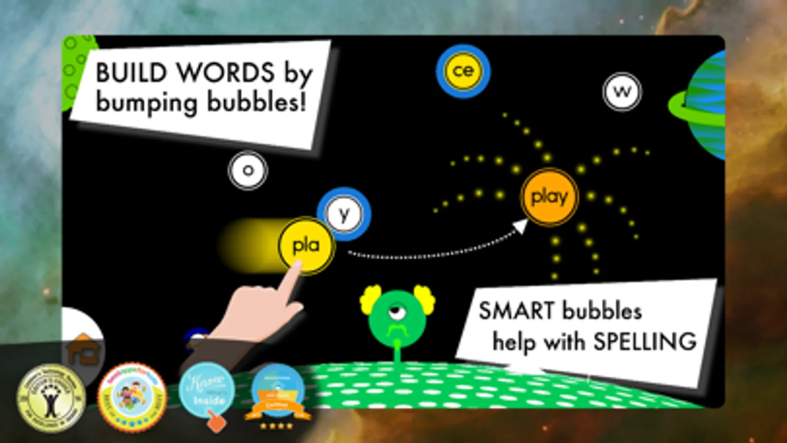 In classrooms and special ed settings, educators use Planet Lettra to scaffold student learning in spelling and phonics. Special pink bubbles can be assigned values in the Settings area and used to work on building words with specific parts (practice specific blends or rhymes).