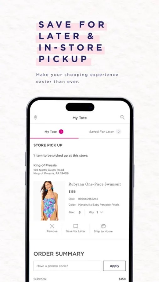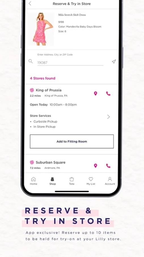 *Reserve & Try in Store: You can now reserve up to 10 of your favorite items to be held to try on at your local store. This commitment-free experience is an easy way to be sure before you buy, and exclusive to the Lilly Pulitzer iOS App.