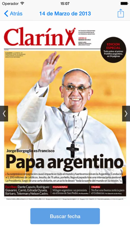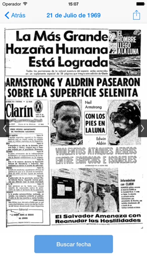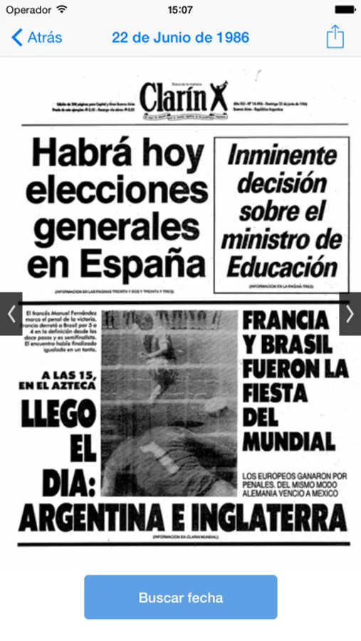La aplicación incluye un sencillo buscador para que encuentres la portada de la fecha que te interesa. Además, podés compartirla en Twitter, Facebook, WhatsApp o con cualquiera de las aplicaciones en iPhone.
