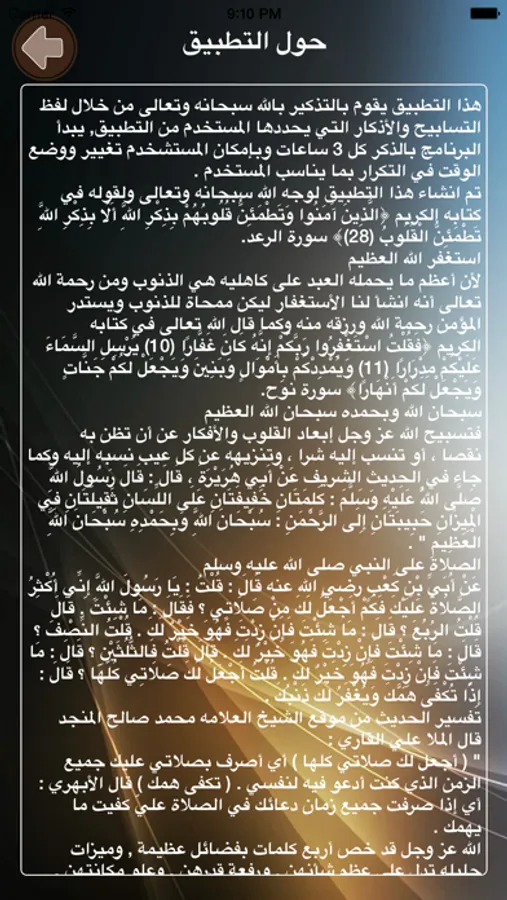 هذا التطبيق يقوم بالتذكير بالله سبحانه وتعالى من خلال لفظ التسابيح والأذكار التي يحددها المستخدم من التطبيق, يبدأ البرنامج بالذكر كل 3 ساعات وبإمكان المستشخدم تغيير ووضع الوقت في التكرار بما يناسب المستخدم .