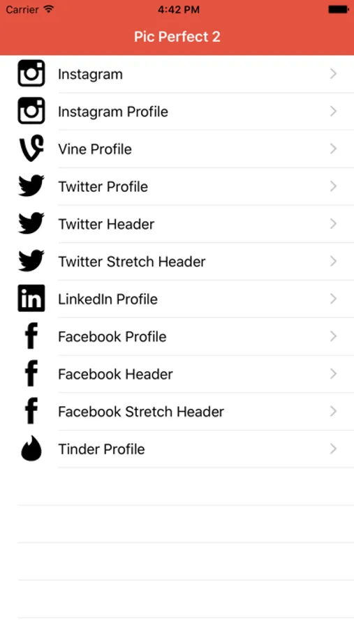 Select the platform you want the image for, pick an image from your library or take one with your camera, and Pic Perfect 2 does the rest.