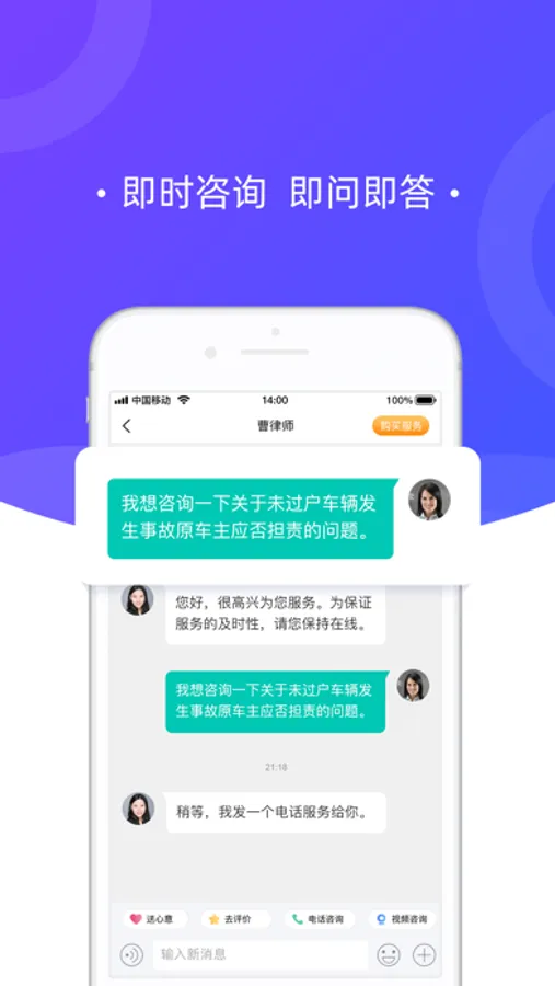2、急速应答,平均用时6秒,律师即刻为你解决法律问题;