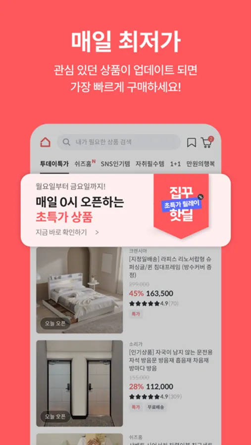 매일 00시 초특가 상품들이 업데이트됩니다. 가장 합리적인 가격으로 인기 상품을 구매할 수 있어요.