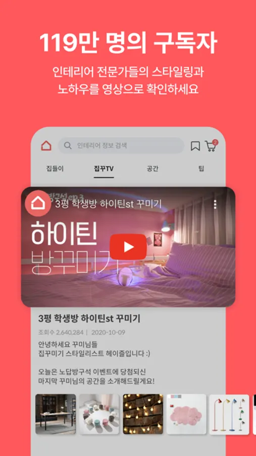 구독자 119만 명이 증명하는 자타공인 인테리어 1위 채널! 인테리어 스타일러들과 전문가들의 제작한 콘텐츠를 통해 멋지고 예쁜 집도 구경하고 그들이 전달하는 팁과 노하우로 나만의 방과 집을 꾸며보세요.