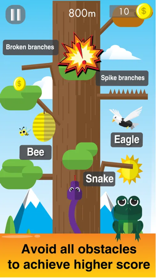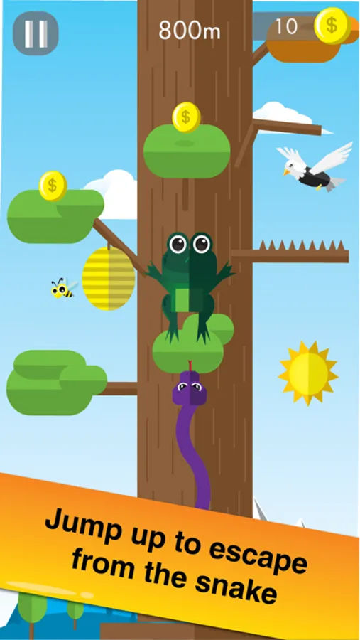 To enjoy the fun Crazy Frog Jump Tap Escape game, tap the screen at left or right to activate the green frog jump to land on tree branch or landing pad. Keep in mind to avoid the path of the hungry bird and bee flying on top of you while avoiding these hungry birds, watch out the angry snake tailing you all the way from below. Don’t land on the tree branch that is slightly cut.