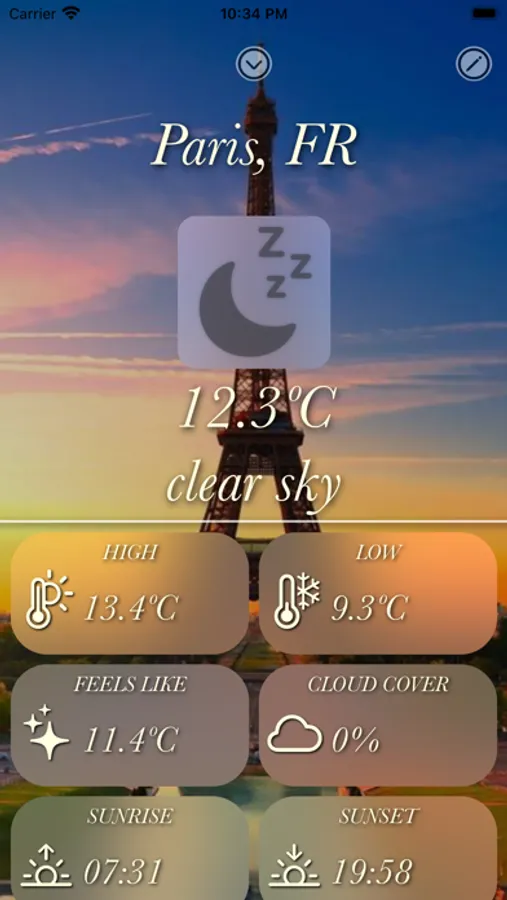 • Current weather for each event's location, including high & low temperature, cloud cover, air pressure, humidity, wind speed & direction.